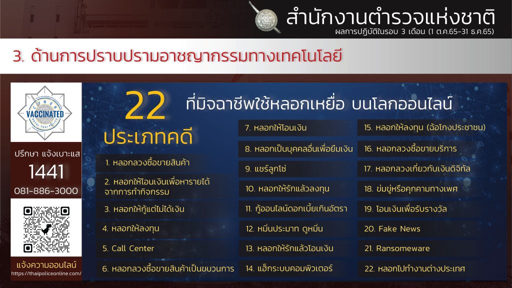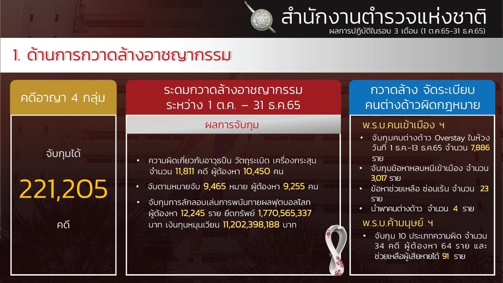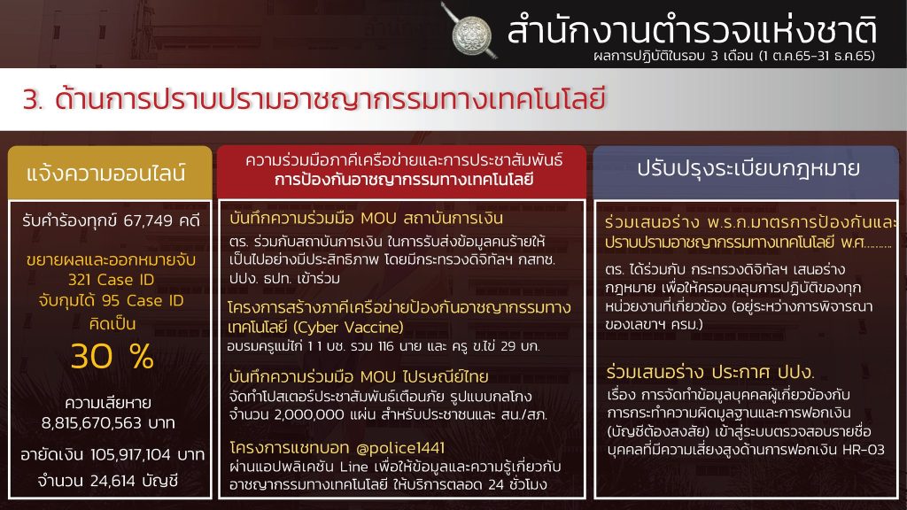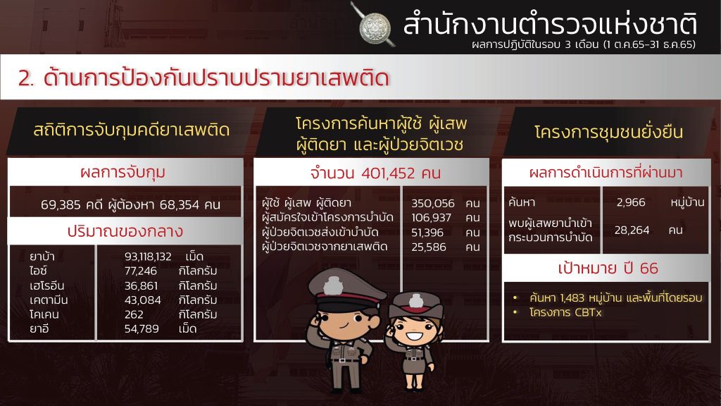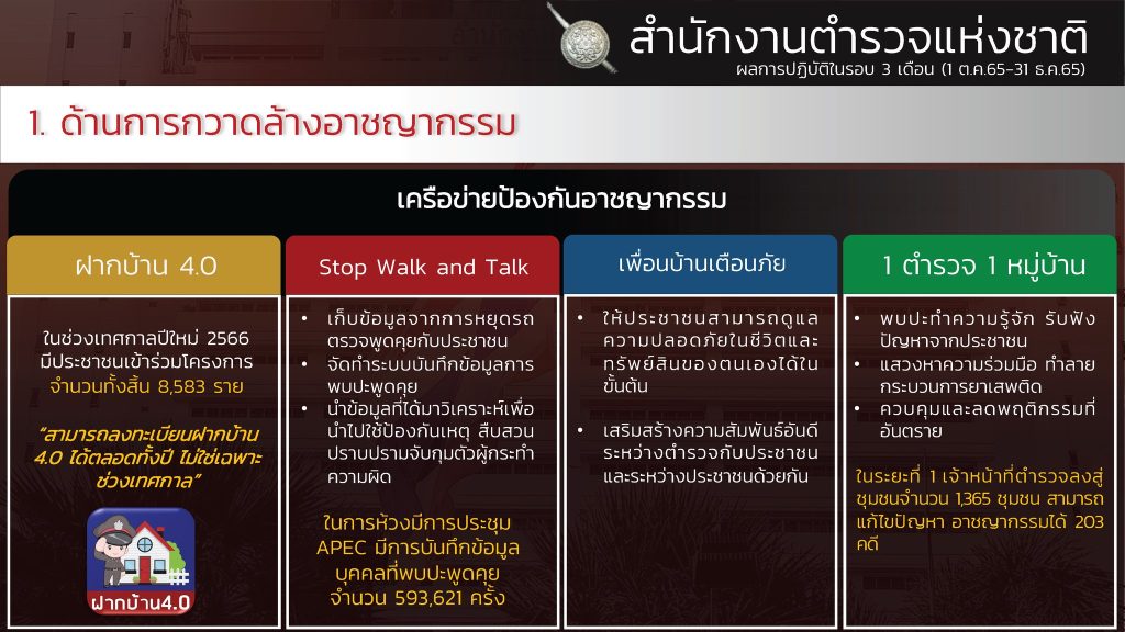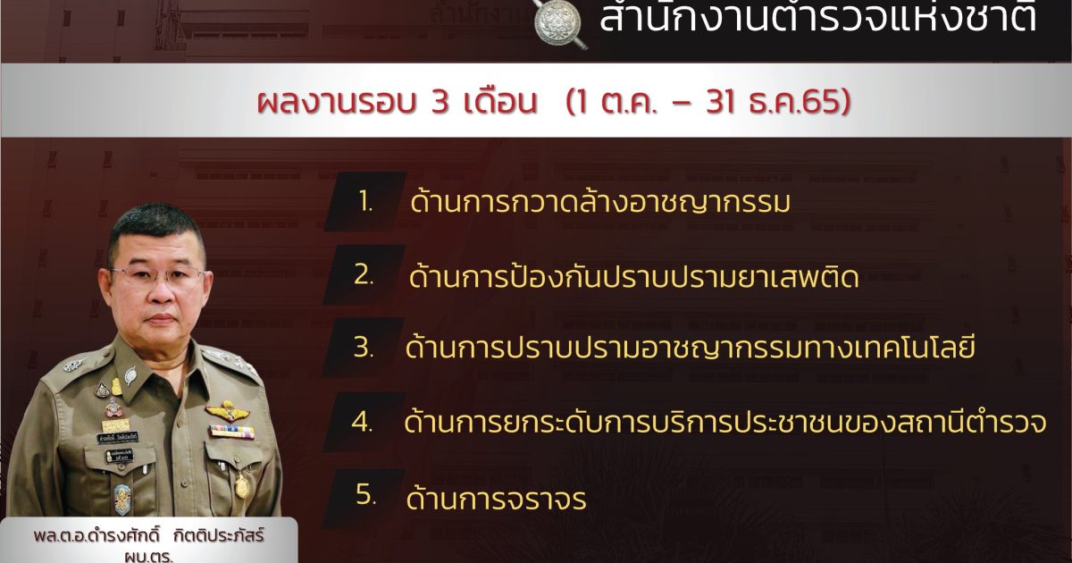 ผลงานรอบ 3 เดือน ของสำนักงานตำรวจแห่งชาติ (1 ต.ค. – 31 ธ.ค. 65) 23 มกราคม 2566 โดย admin / การมีส่วนร่วมของหัวหน้าสถานี Facebook iconFacebookTwitter iconTwitterLINE iconLine